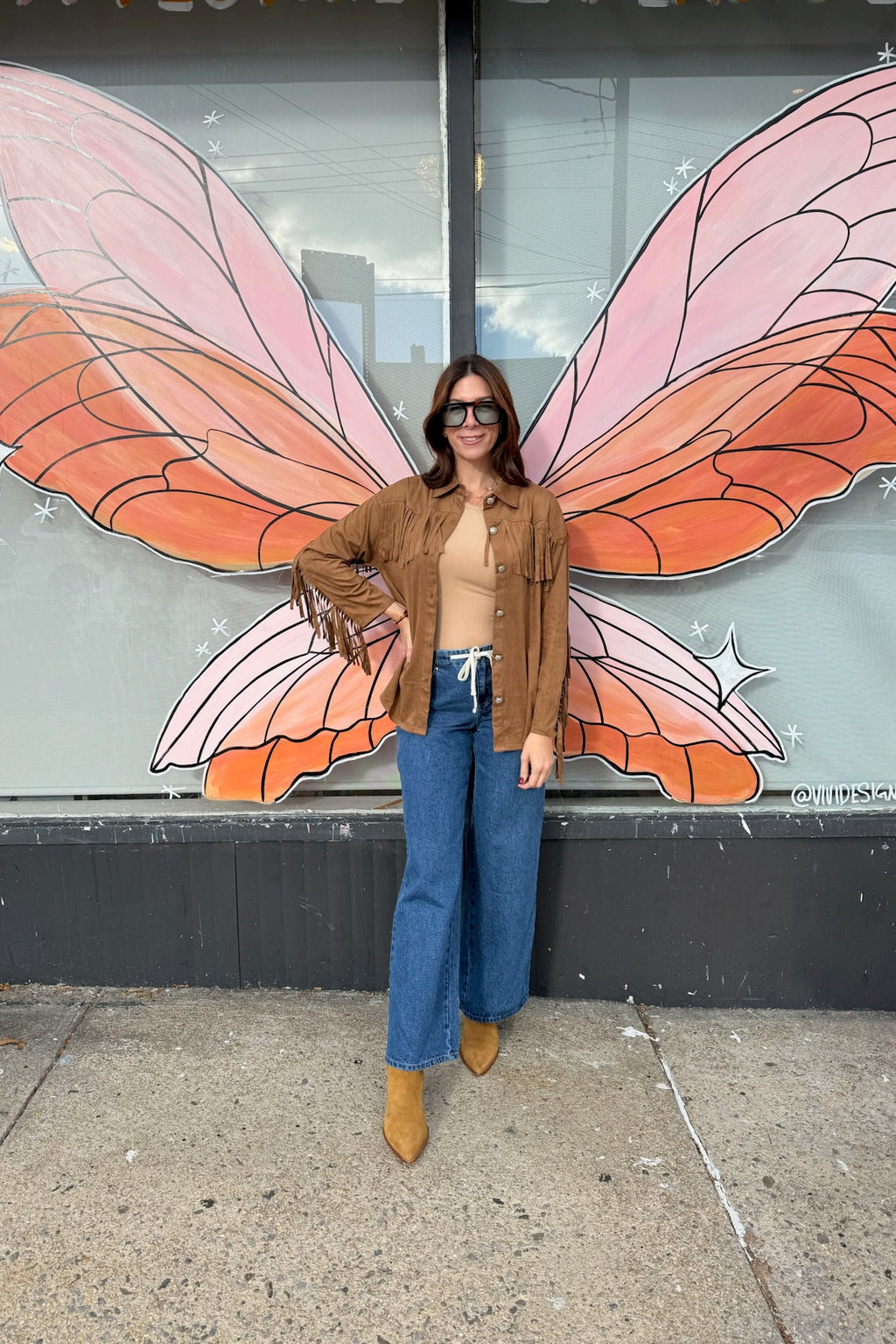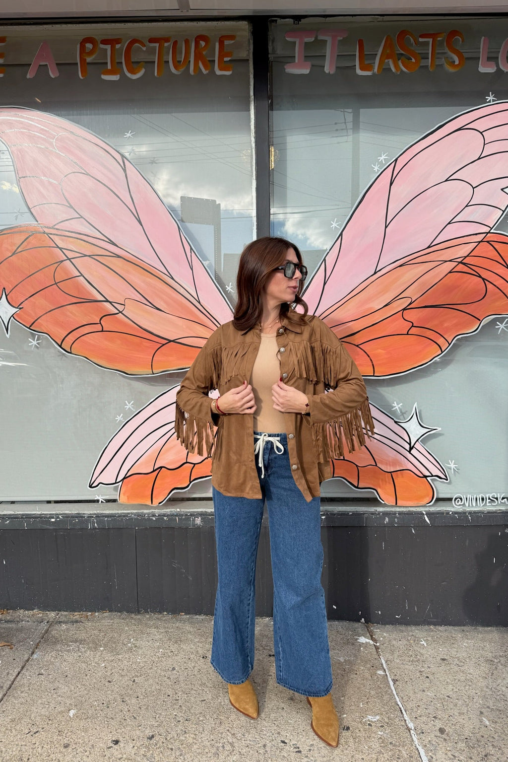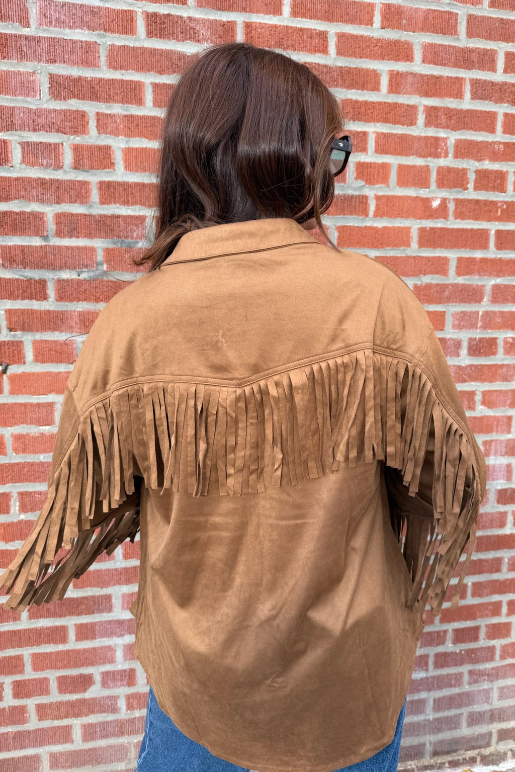 featuring playful fringe details, a button-down front, and long sleeves, this western-inspired shacket adds a fun, flirty twist to your wardrobe. perfect for layering and turning heads wherever you go.