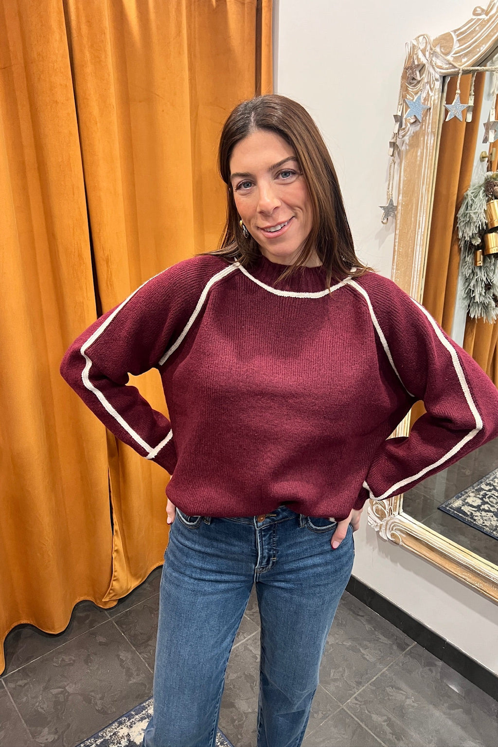 wrap yourself in cozy charm with the cranberry bliss mock neck sweater.