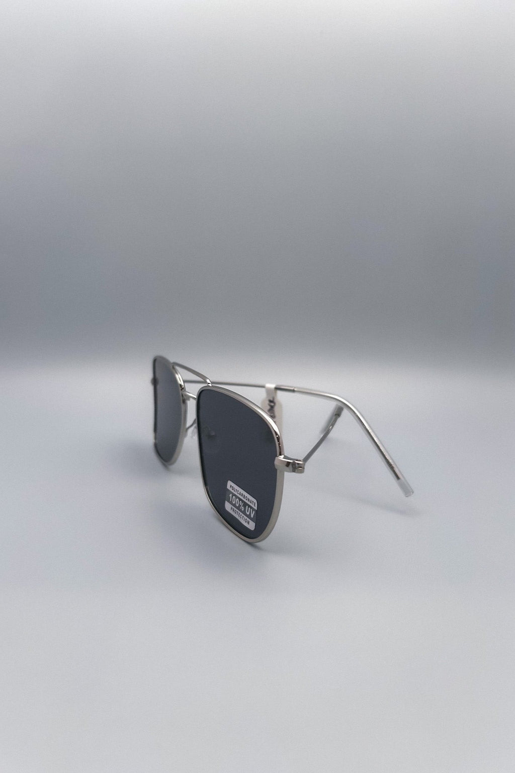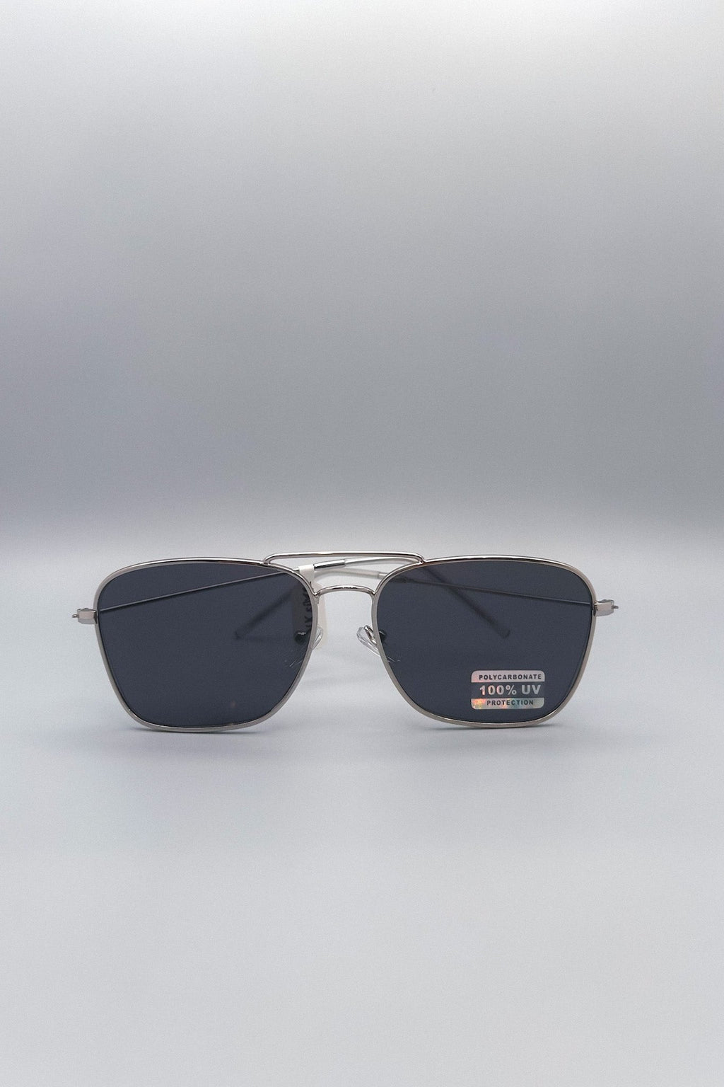 black tinted silver frame aviator sunglasses