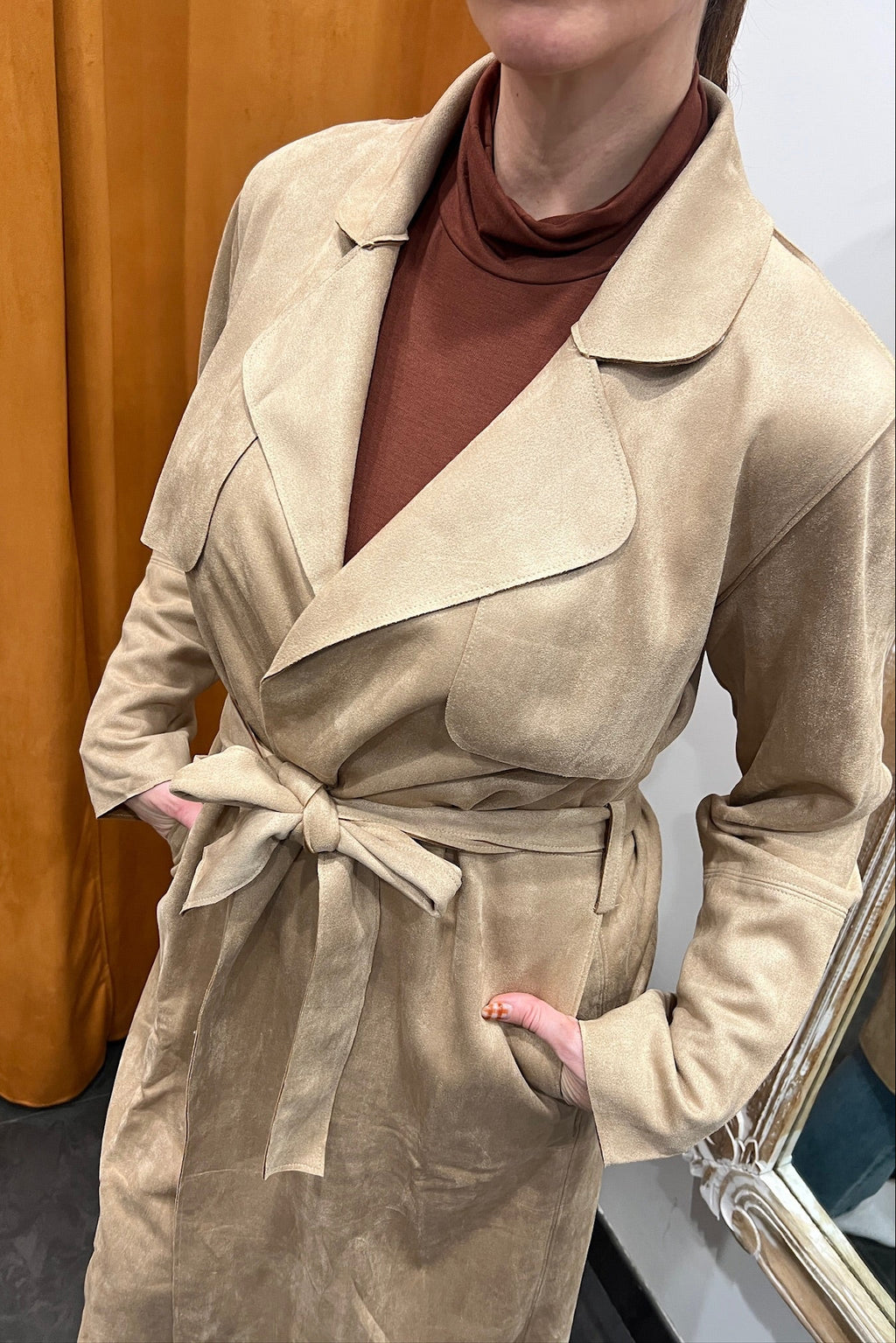 wrap yourself in timeless style with this classic camel microsuede trench coat—the ultimate wardrobe essential.